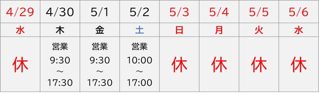 ・5月3日(日)~5月6日(水) 休業