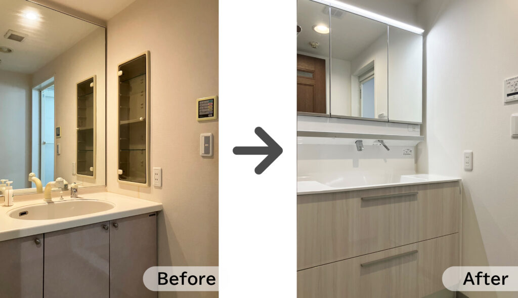 壁の埋込収納を撤去して、小物類をミラー内部と引き出し内部に収納できるようにしました。