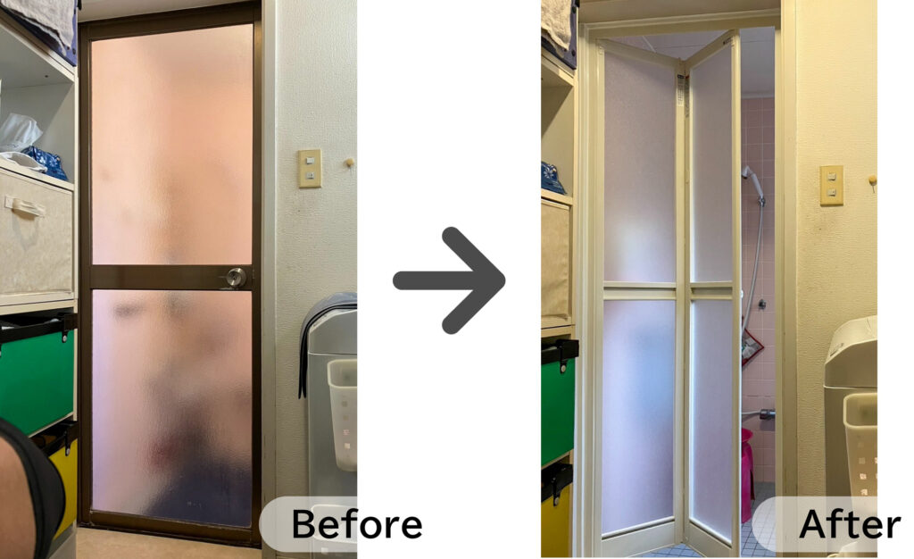 浴室ドアは、浴室側に開く片開きドアから中折れドアに取替えました。